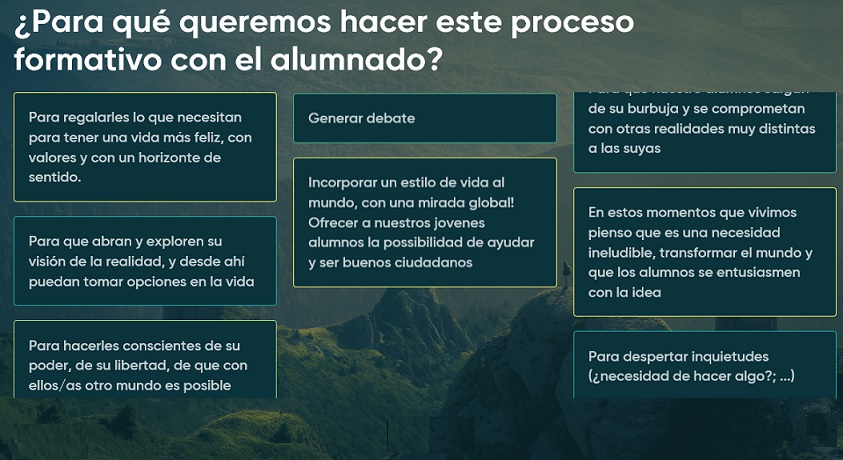 En el pasado mes de octubre tuvimos diferentes webinars como la realizada, el 22 de octubre, “8 píldoras para Salir a la Vida y Transformar el Mundo”, con la colaboración del Secretariado de Centros de la Institución Teresiana, dónde 25 tutoras y tutores de 4º de la ESO, Bachillerato y Formación Profesional de 12 centros educativos conocieron la unidad didáctica (la puedes descargar haciendo click aquí),