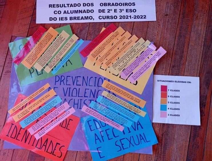 Como ya expliqué previamente estamos trabajando en base a la campaña de INTERED “Toca Igualdad”, y para la fase de identificación empleamos la actividad diseñada por la misma ONGD llamada la “Tarta Coeducativa”. Para hacerlo y, con apoyo de la orientadora del IES, adaptamos las “situaciones sentidas”, en contenido y lengua a la realidad del instituto. Esta metodología nos ha permitido que el alumnado priorizase las situaciones más prevalentes en su instituto, con relación a las violencias machistas y a la salud mental. En base a esta información, vimos la necesidad de profundizar en el tema de la autoestima. Así estamos desarrollando la segunda fase del proceso que se ayuda del manual “Recorre tu laberinto. Manual de género y autoestima”.