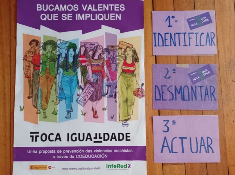 Estructuramos el proceso en tres fases, como la campaña “Toca Igualdad” de INTERED: 1º identificar, la 2º desmontar y reflexionar y la 3º actuación del alumnado de cara a la comunidad. En la presentación que hice cuenta la experiencia de la primera fase del proceso de identificación, la misma que llevamos a cabo con el alumnado de 2º y 3º de la ESO, con chicos y chicas de entre 13 y 14 años, en los meses de noviembre y diciembre de 2021. Actualmente, ya estamos en la segunda parte del proceso, con los talleres de reflexión. Para hacerlo tomamos como base los ejes de esta campaña, que incluye los temas de: Cuidados del planeta y de las personas, Educación Afectivo y Sexual, Diversidad de Identidades y Violencias Machistas.