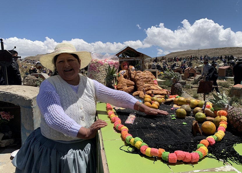 Cada 1 de noviembre (Día de los muertos) los y las difuntas regresan a sus casas en forma de muñecas de pan (las tantawawas) y toman lugar en un altar repleto de frutas y comida que los familiares preparan para honrarlas. A los lados, se coloca una escalera de pan para que el difunto descienda y regrese a su casa sin contratiempos. Un caballo, también de masa de pan, le llevará la comida y un árbol de caña de azúcar le servirá de bastón y sombra. Tampoco falta el agua, para que el tránsito sea fluido. El altar se completa con panes en forma de cruz y platillos típicos, refrescos y hojas de coca. El festejo se prolonga en los cementerios, donde la música acompaña a las almitas para que tengan una despedida alegre.