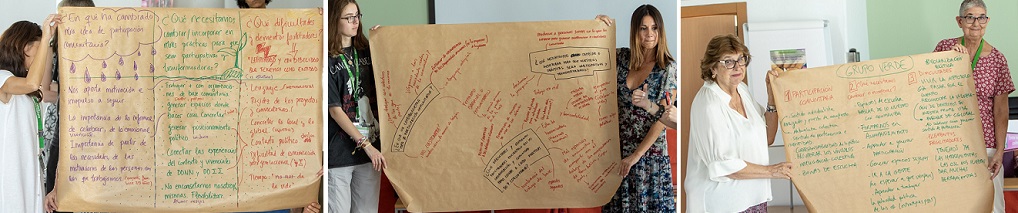 Tras este conversatorio, rico en experiencias y vivencias, realizamos grupos de trabajo para debatir y dialogar sobre en qué ha cambiado nuestra idea de participación comunitaria; qué necesitamos incorporar en nuestras prácticas para que sean participativas y comunitarias; y qué dificultades y elementos facilitadores encontramos.